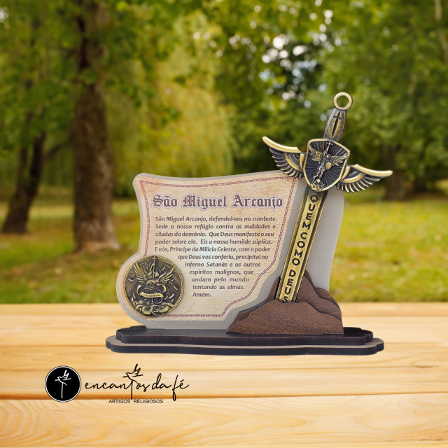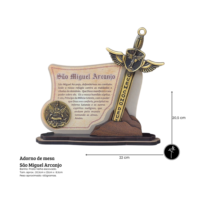 Adorno de Mesa São Miguel Arcanjo é uma peça única que traz proteção e charme para o seu ambiente. Feito em MDF, este adorno apresenta uma medalha e uma espada em metal com banho ouro velho escovado, garantindo durabilidade e beleza.